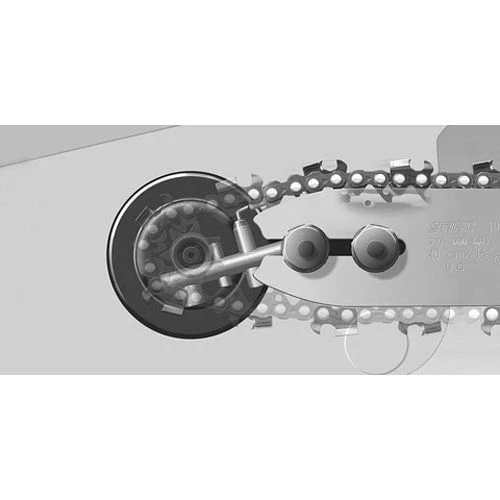 - Le tendeur de chaînes rapide Stihl (B) facilite nettement la tension de la chaîne. Dès que le couvercle du pignon de chaîne est desserré, la tension de la chaîne se règle à l’aide d’une simple molette, sans le moindre outil.